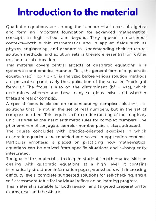 Algebra – Quadratic Equations and Complex Solutions | Advanced Problem Solving Workbook | GRADE 8–11