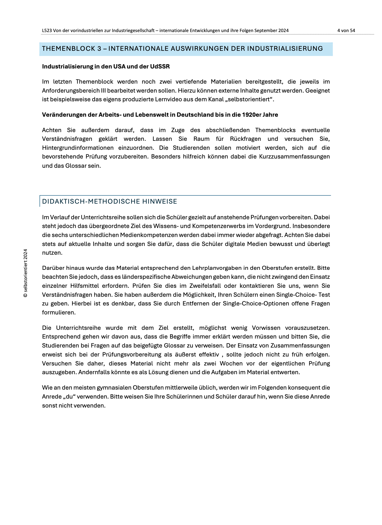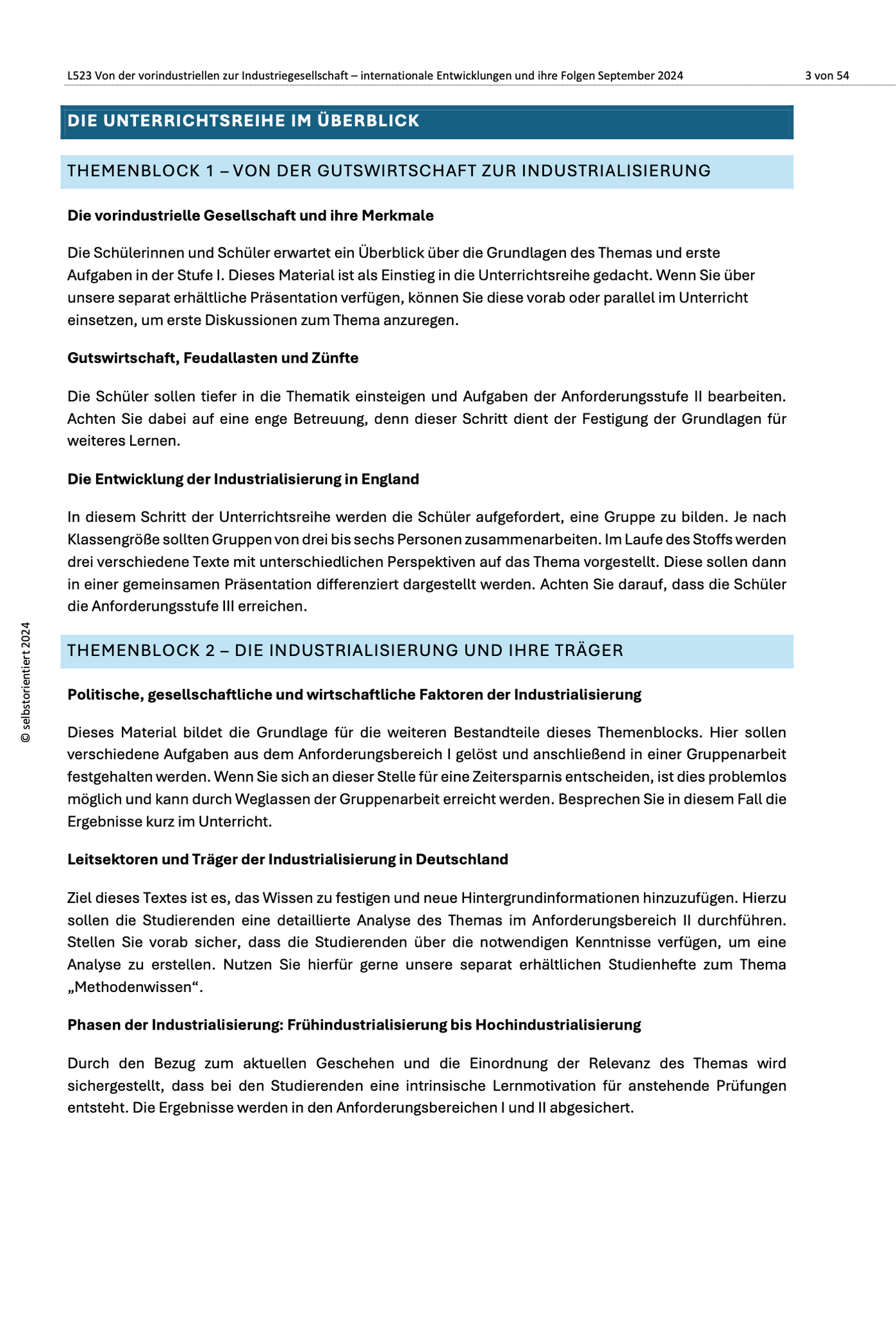 Die Reihe umfasst detaillierte Stundenpläne, Aufgabenblätter, Quellenanalysen und Präsentationsfolien zu acht zentralen Themen: von der vorindustriellen Gesellschaft über die Industrialisierung in England und Deutschland bis hin zu den sozialen Auswirkungen in den 1920er Jahren. Die Materialien sind für unterschiedliche Niveaus und Klassenstufen ausgelegt und bieten Aufgaben in den Anforderungsbereichen 1 bis 3, die den Unterricht differenzieren und die Lernenden aktiv einbinden.