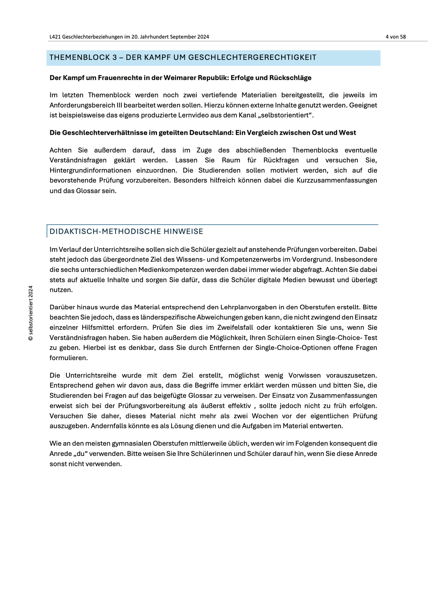 Die Unterrichtsreihe deckt alle wichtigen Themen ab: von der Krise der Männlichkeit nach dem Ersten Weltkrieg, über die Herausforderungen und Erfolge der Frauenbewegung in der Weimarer Republik, bis hin zu den radikalen Veränderungen durch die 68er-Bewegung und den gesellschaftlichen Umgang mit Homosexualität nach 1945. Jede Unterrichtseinheit ist sorgfältig geplant und bietet klare Lernziele, methodische Hinweise und vielfältige Aufgabenstellungen, die den individuellen Lernbedürfnissen Ihrer Schülerinnen und Schüler gerecht werden.