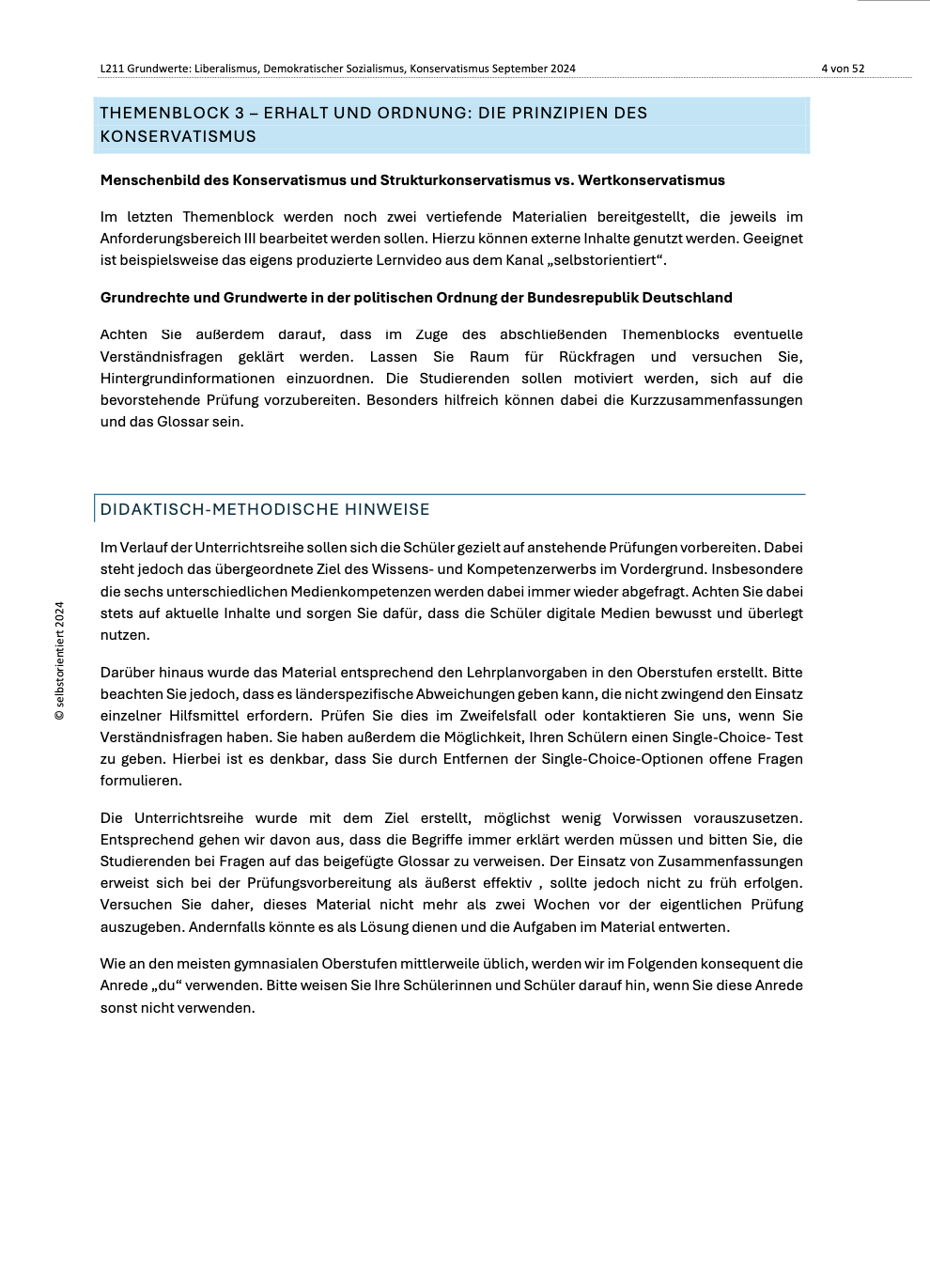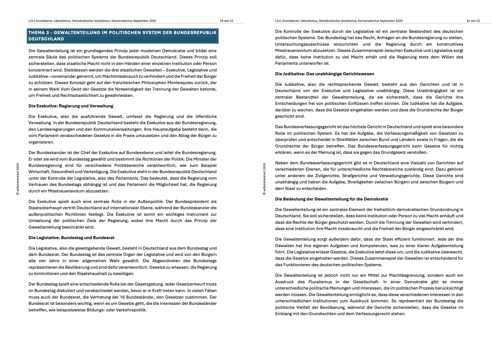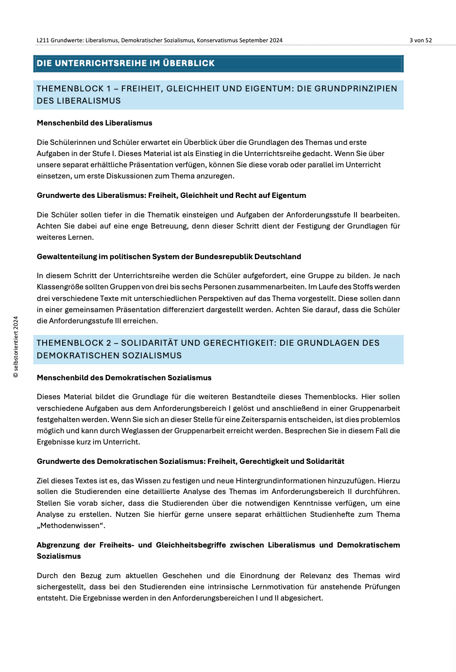 Unsere Unterrichtsreihe bietet Ihnen alle notwendigen Materialien, um das Thema "Grundwerte: Liberalismus, Demokratischer Sozialismus, Konservatismus" effizient und strukturiert zu unterrichten. Die Inhalte sind auf die Bedürfnisse Ihrer Schülerinnen und Schüler zugeschnitten und umfassen ausführliche Erklärungen der politischen Ideologien, ihre Menschenbilder und die wesentlichen Grundwerte wie Freiheit, Gleichheit und Solidarität. Sie finden detaillierte Aufgaben in drei Schwierigkeitsbereichen, die sich ideal für den Unterricht und die Vorbereitung auf Prüfungen eignen. Mit diesen Materialien fördern Sie analytisches Denken und eine tiefere Auseinandersetzung mit den Inhalten.