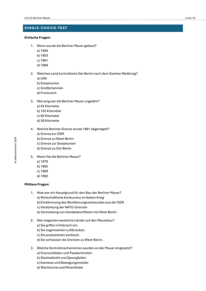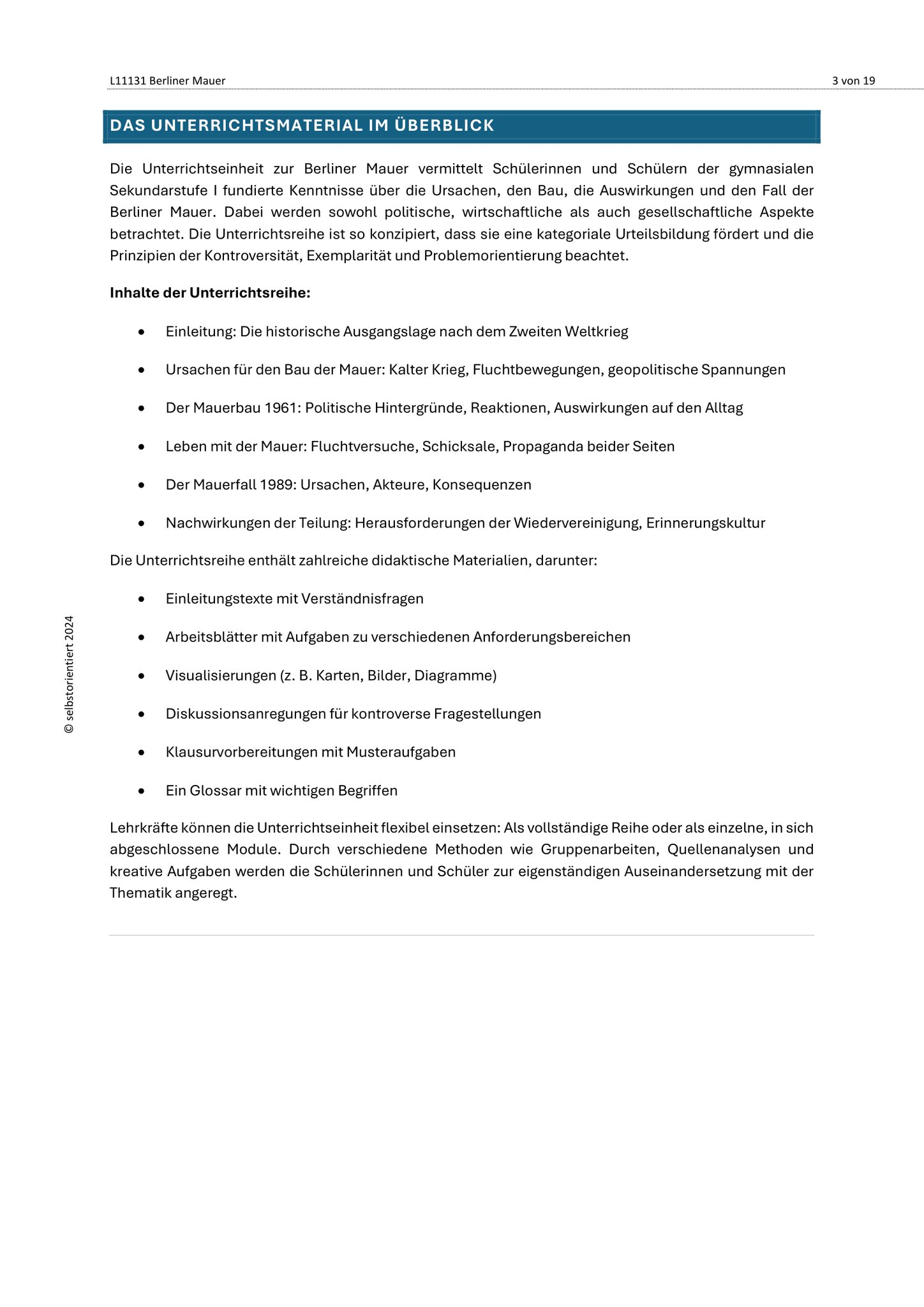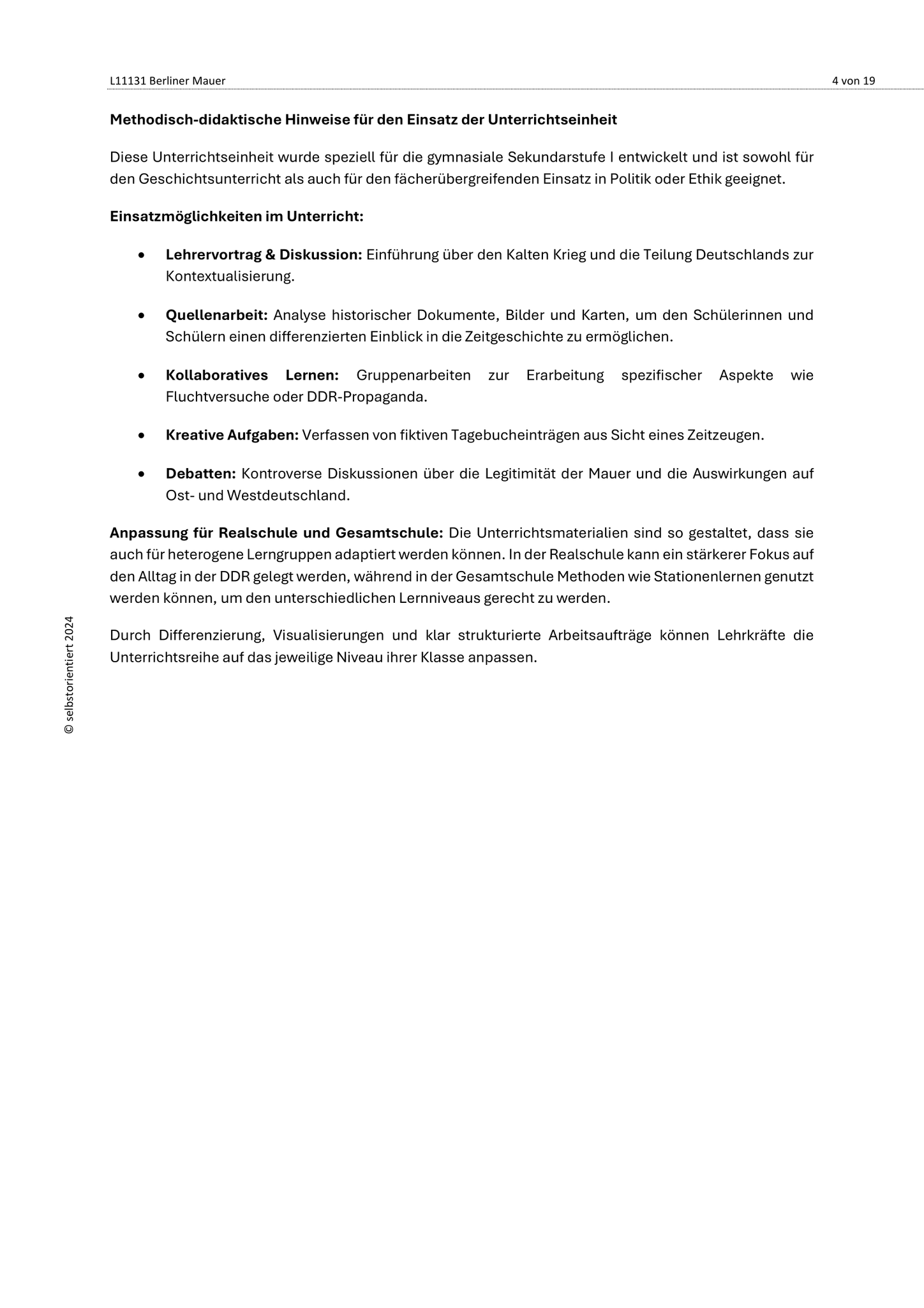 Die Unterrichtsreihe ist fachdidaktisch aufgebaut und direkt auf die aktuellen Lehrpläne der Bundesländer abgestimmt. Sie enthält abwechslungsreiche Arbeitsblätter, kreative Aufgaben, anschauliche Visualisierungen und fundierte Hintergrundtexte. Auch komplexe Themen wie Fluchtversuche, Propaganda und internationale Reaktionen werden altersgerecht und nachvollziehbar dargestellt.