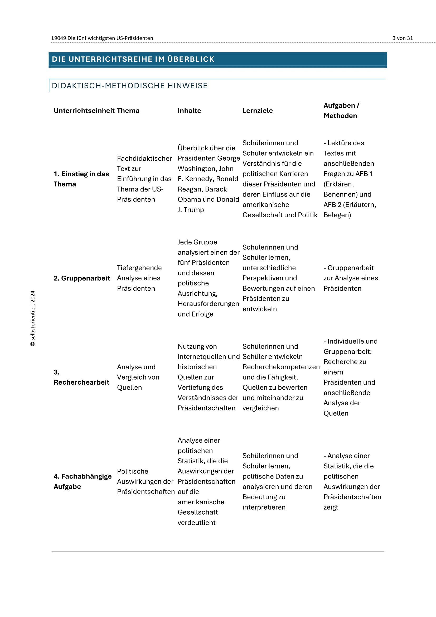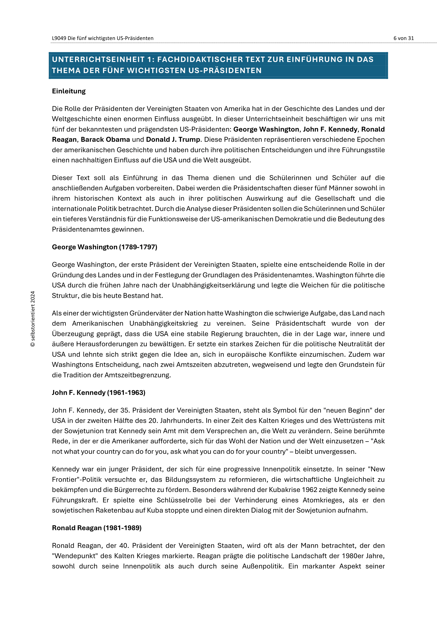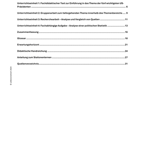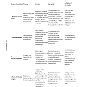 Dieses umfangreiche Unterrichtsmaterial beleuchtet die Rolle und Wirkung fünf zentraler US-Präsidenten in der Geschichte der Vereinigten Staaten: George Washington, John F. Kennedy, Ronald Reagan, Barack Obama und Donald J. Trump. Das Material eignet sich ideal für den Geschichtsunterricht in der gymnasialen Oberstufe (SEK II) und ermöglicht eine differenzierte Auseinandersetzung mit politischer Führung, Ideologie, Medienwirkung und historischem Wandel.